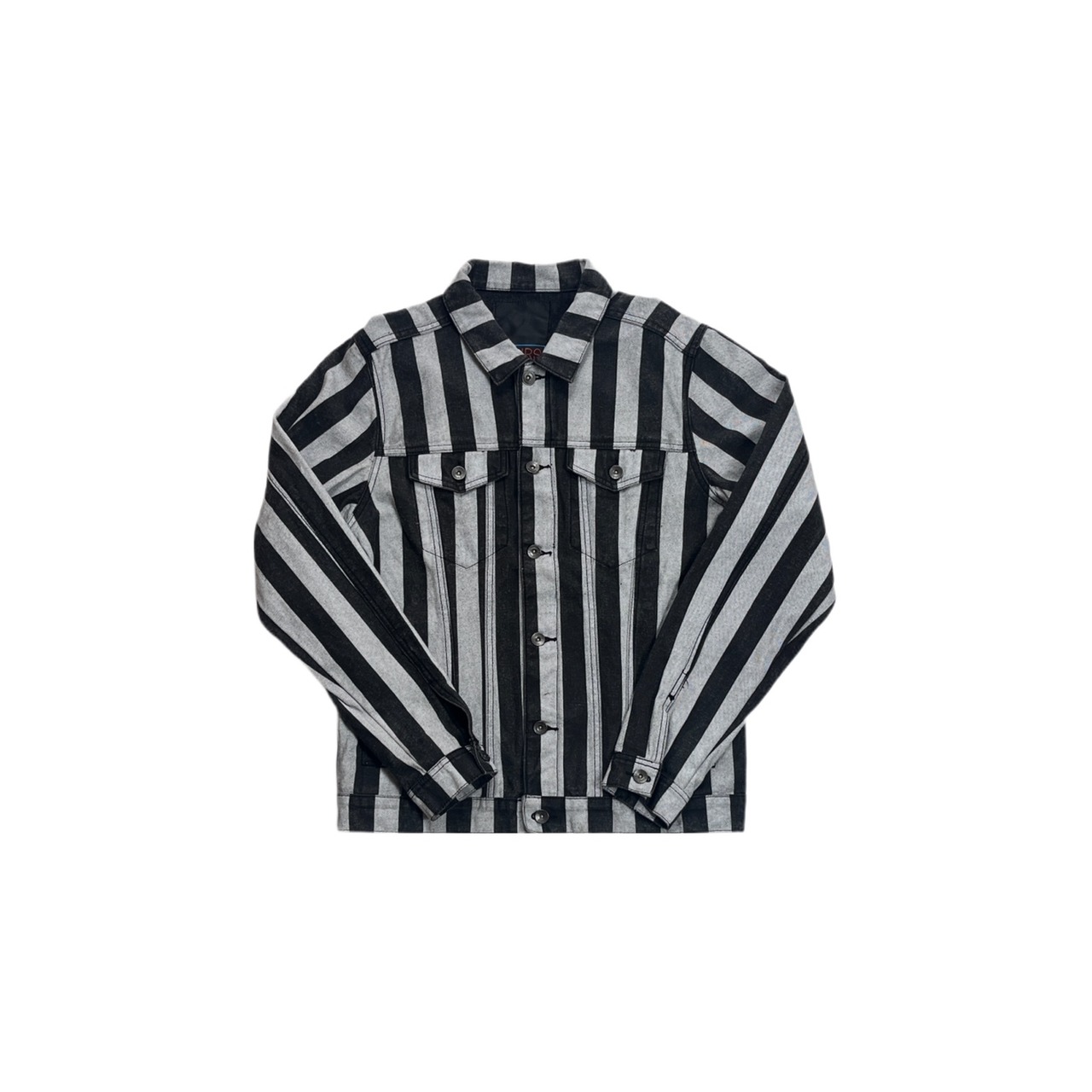 ストレッチの効いた細身のボディに太い白黒のストライプが印象的なジャケット